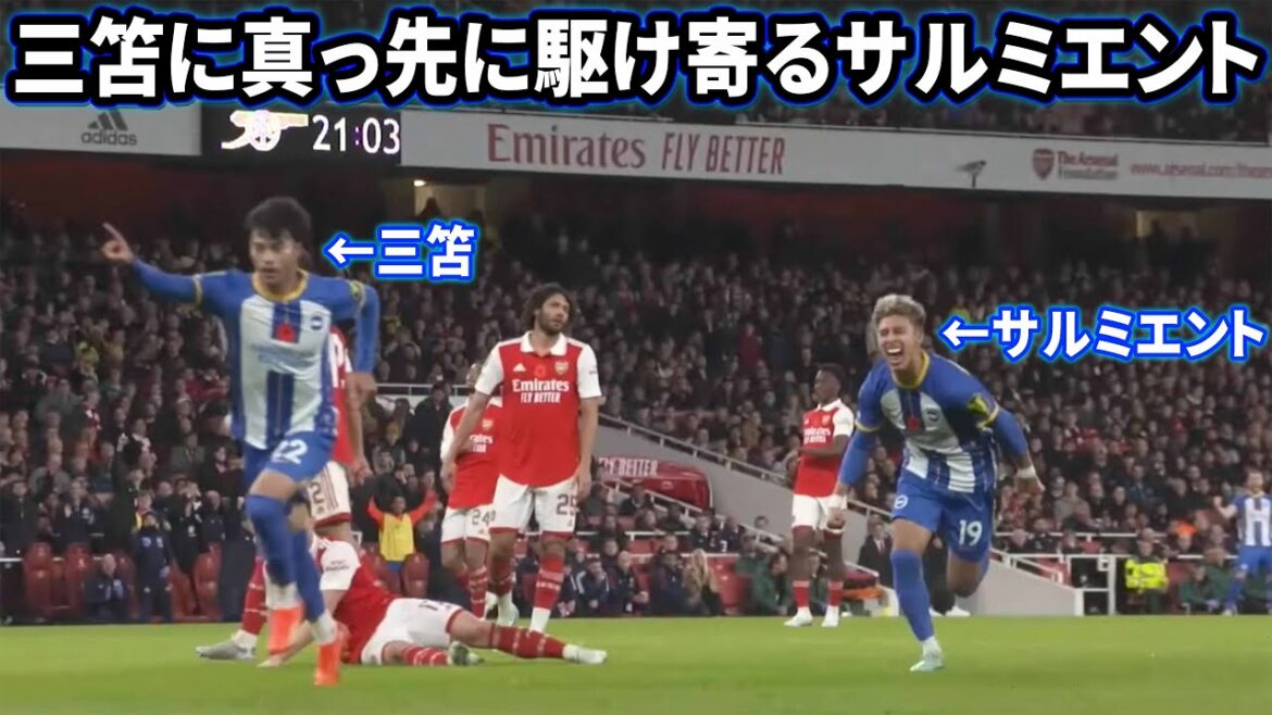ゴール決めた三笘薫に真っ先に駆け寄るサルミエント