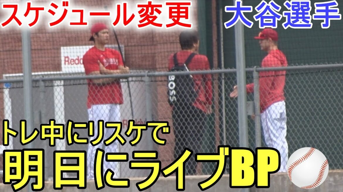 トレーニング中にスケジュール変更で明日にライブBPを行うことを報告される大谷翔平選手。