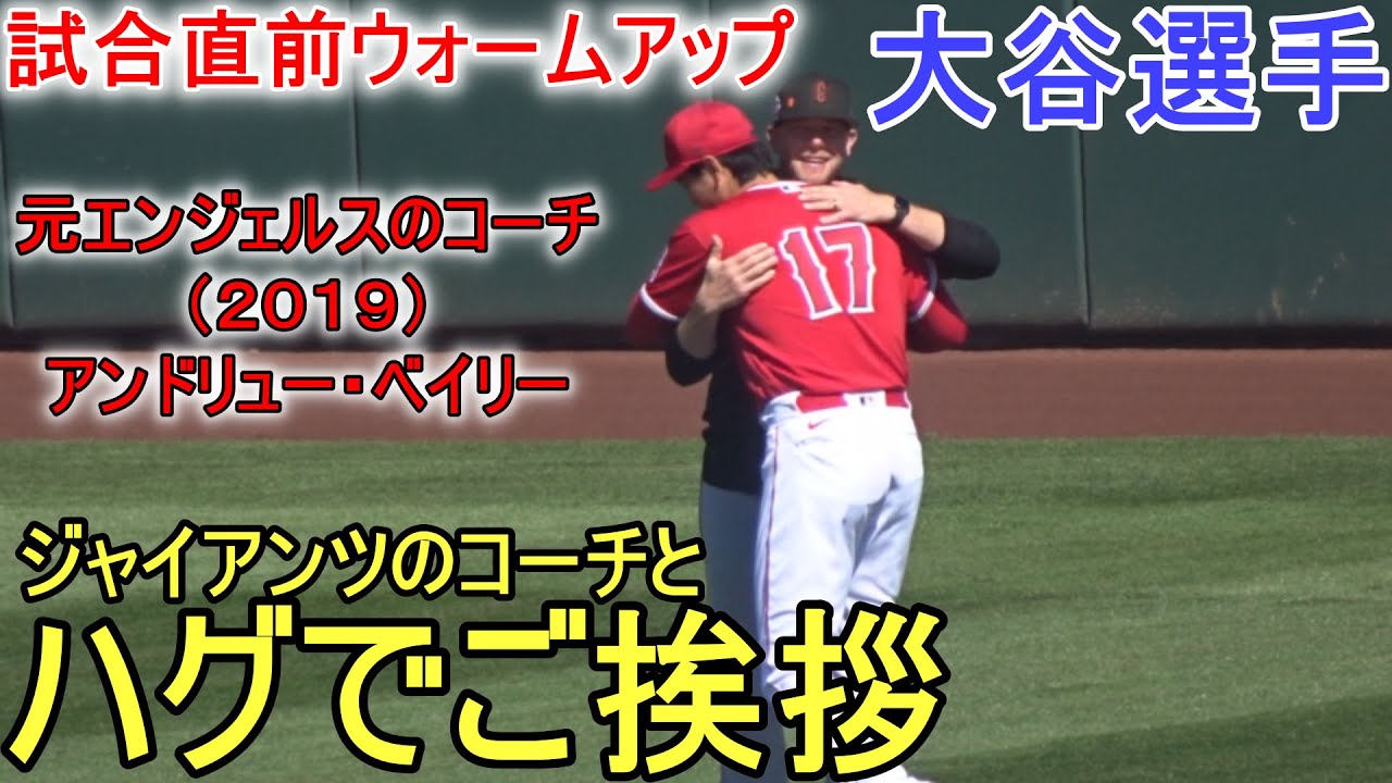 ウォームアップ中に走り寄って、サンフランシスコ・ジャイアンツのアンドリュー・ベイリー投手コーチとハグで挨拶をする大谷翔平選手。