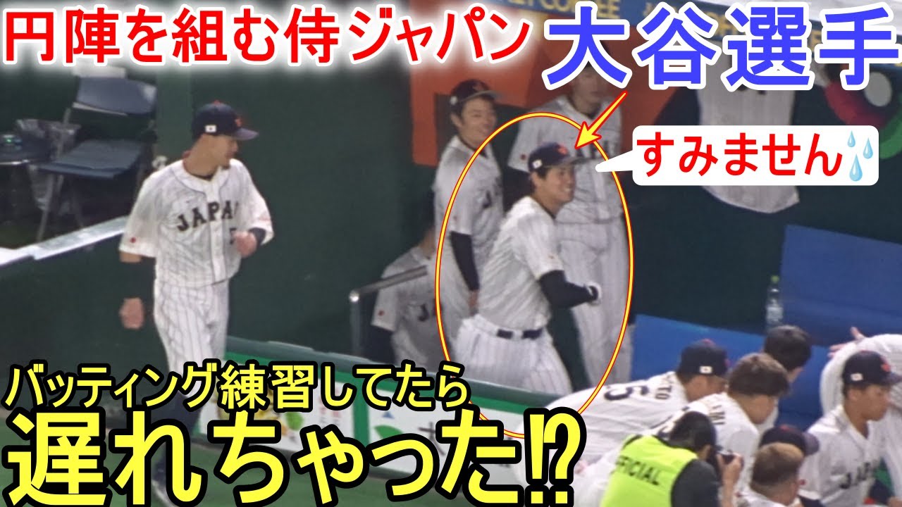 試合直前に円陣を組む侍ジャパン。しかし、大谷翔平選手の姿が見えない!バッテイング練習に夢中で、気づかずに遅れてしまった様子。 WBC2023~チェコ戦~ 3番DHで出場の大谷翔平選手 @shinsukehandyman #大谷翔平 #wbc2023 #侍ジャパン 2023BaseballJapanMajor League BaseballMLBohtaniOhtani ShoheishoheiShohei OHtaniWBC侍ジャパン円陣大谷大谷翔平日本翔平速報 NIHON2020.COM