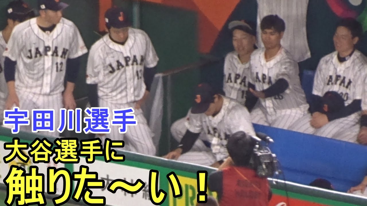 大谷翔平選手に触りたい宇田川選手。ダグアウトで座っている大谷選手の後ろに座り、気づかれない様に大谷選手の背中を触る宇田川選手。栗林選手も一緒にゲーム感覚で大谷選手を触る。