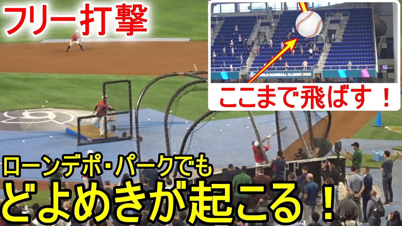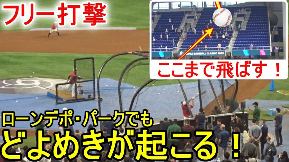 ローンデポ・パークでフリー打撃をする大谷翔平選手。場内のファンからどよめきが起き、場内が騒然となる。