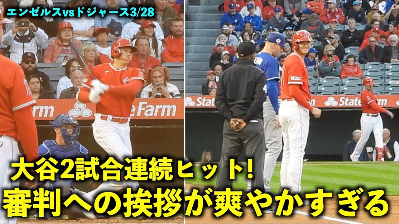 大谷翔平 審判に話しかけられた時の笑顔が爽やかすぎる! 強烈ヒットで2試合連続安打!【現地映像】エンゼルスvsドジャース3/28