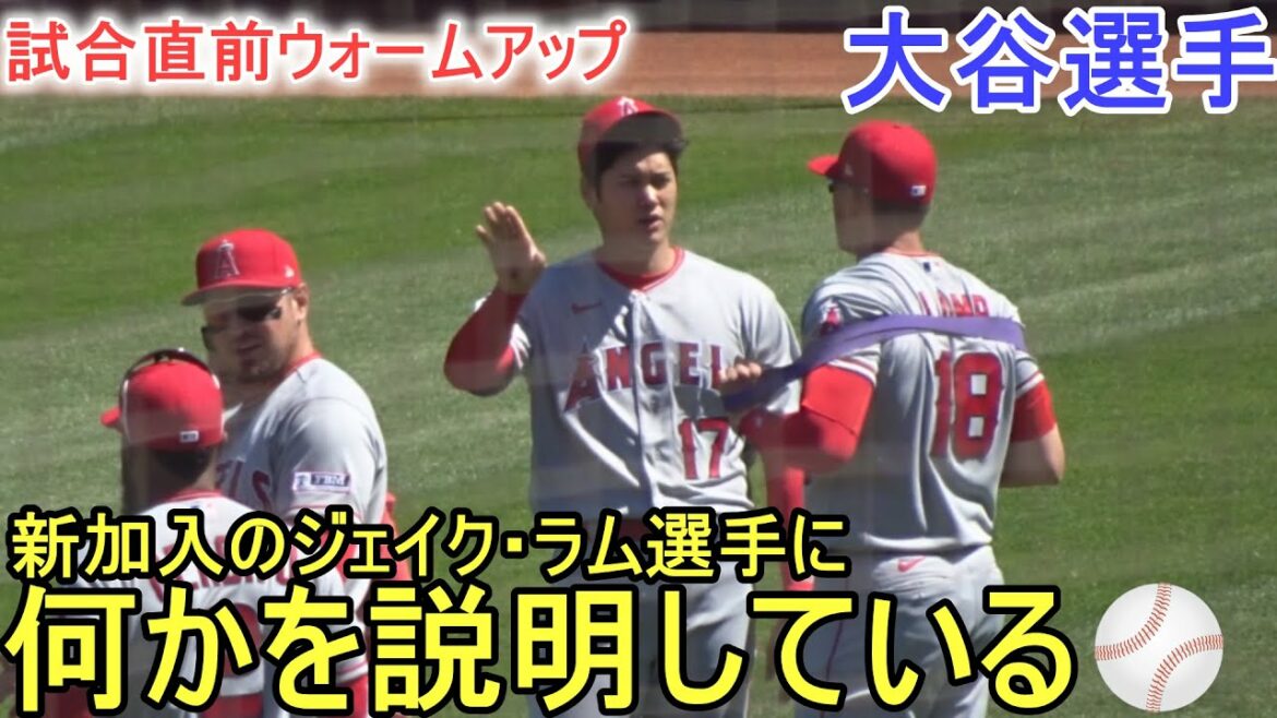 試合直前ウォームアップ中、エンジェルスに新加入のジェイク・ラム選手に何かを説明している大谷翔平選手。