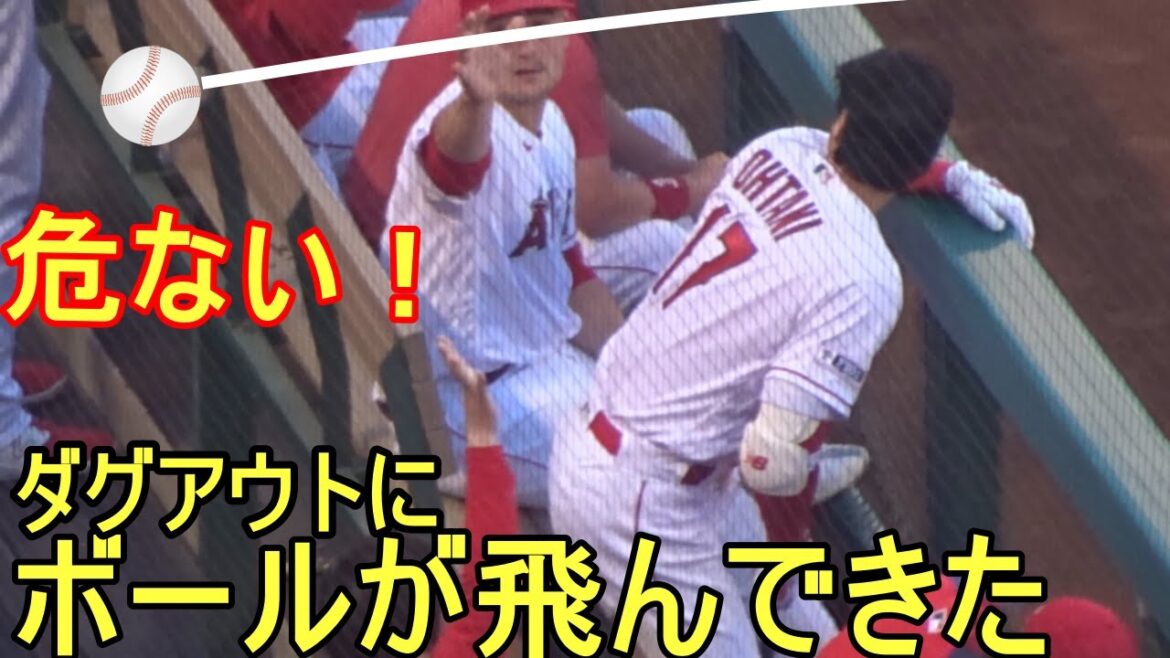 ダグアウトに飛んできたファウルボールを避ける大谷翔平選手。