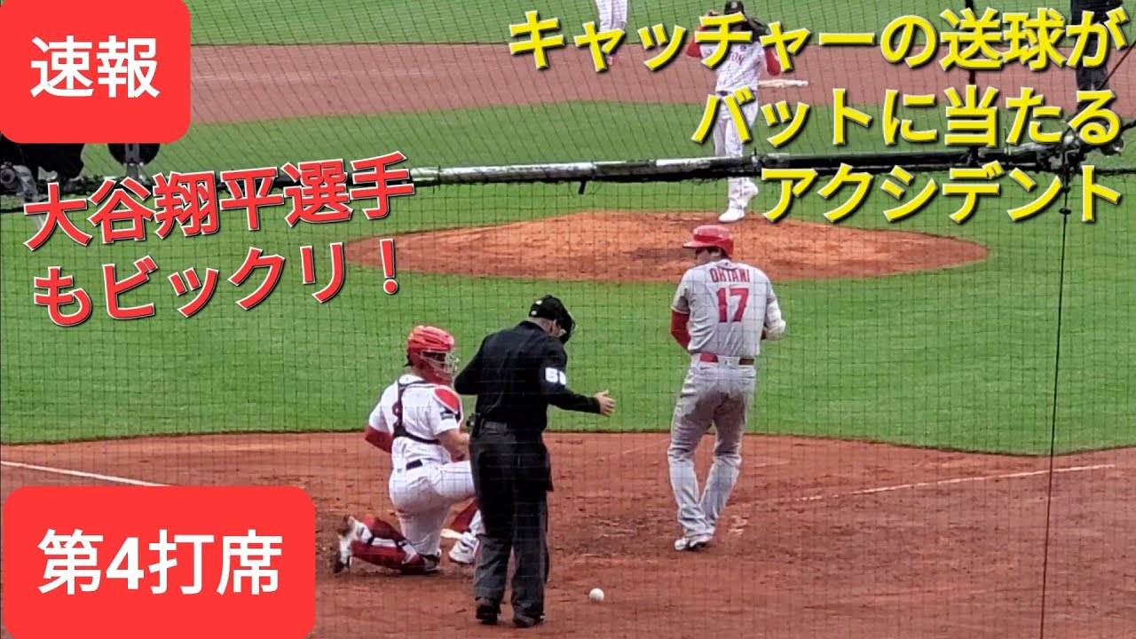 第4打席【大谷翔平選手】1アウトランナー1塁からの打席‐キャッチャーの送球がバットに当たるアクシデントで大谷翔平選手もビックリ‼️