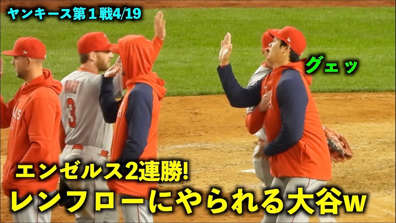 エンゼルス2連勝!勝利のハイタッチでレンフローにやられる大谷翔平w【現地映像】ヤンキース第1戦4/19