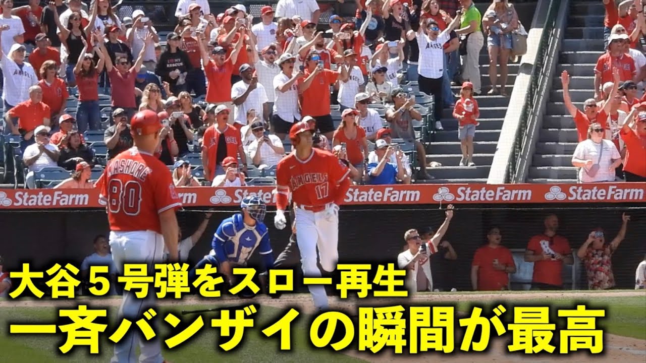 大谷翔平5号弾をスロー再生!口ぱっか〜んからの一斉バンザイの瞬間が最高すぎる!【現地映像】エンゼルスvsロイヤルズ第3戦4/24