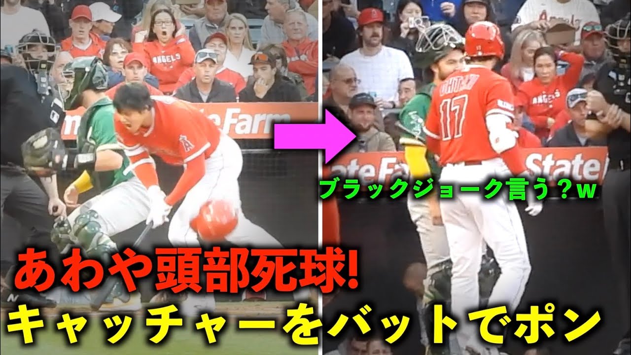 ブラックジョーク言った?w大谷翔平 危険球を回避後にキャッチャーをバットでポンw【現地映像】エンゼルスvsアスレチックス第1戦4/25