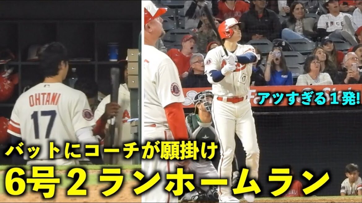 コーチが大谷翔平のバットに願掛け!直後に6号2ランホームラン!【現地映像】エンゼルスvsアスレチックス第3戦4/27