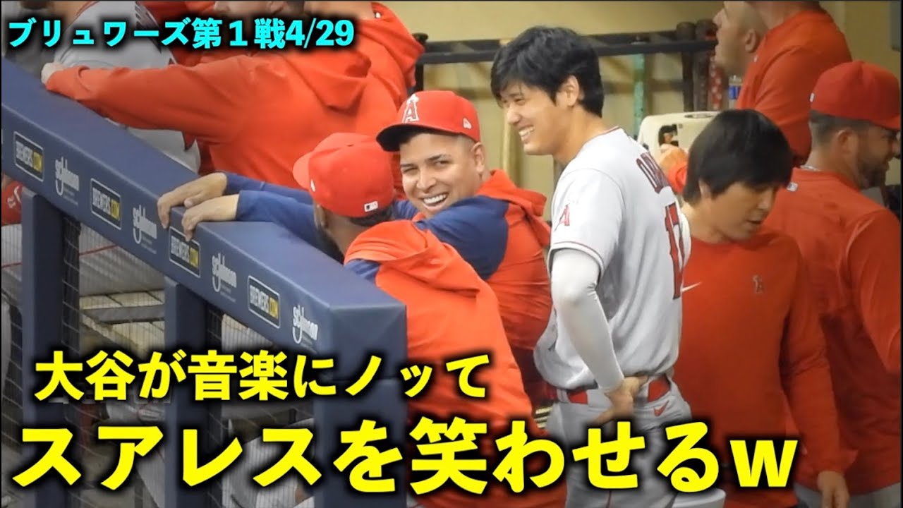 これは元気出るw 大谷翔平が音楽にノッてスアレスを笑わせるw【現地映像】エンゼルスvsブリュワーズ第1戦4/29