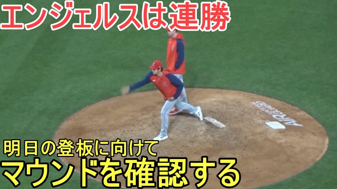 エンジェルスの勝利でマウンドに集まる選手たち。大谷翔平選手は明日の登板に向けてマウンドをチェックする。