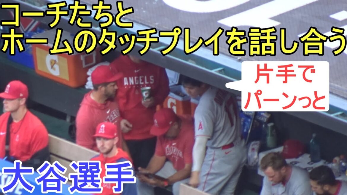 ホームでのタッチプレイをコーチたちと話し合う大谷翔平選手。