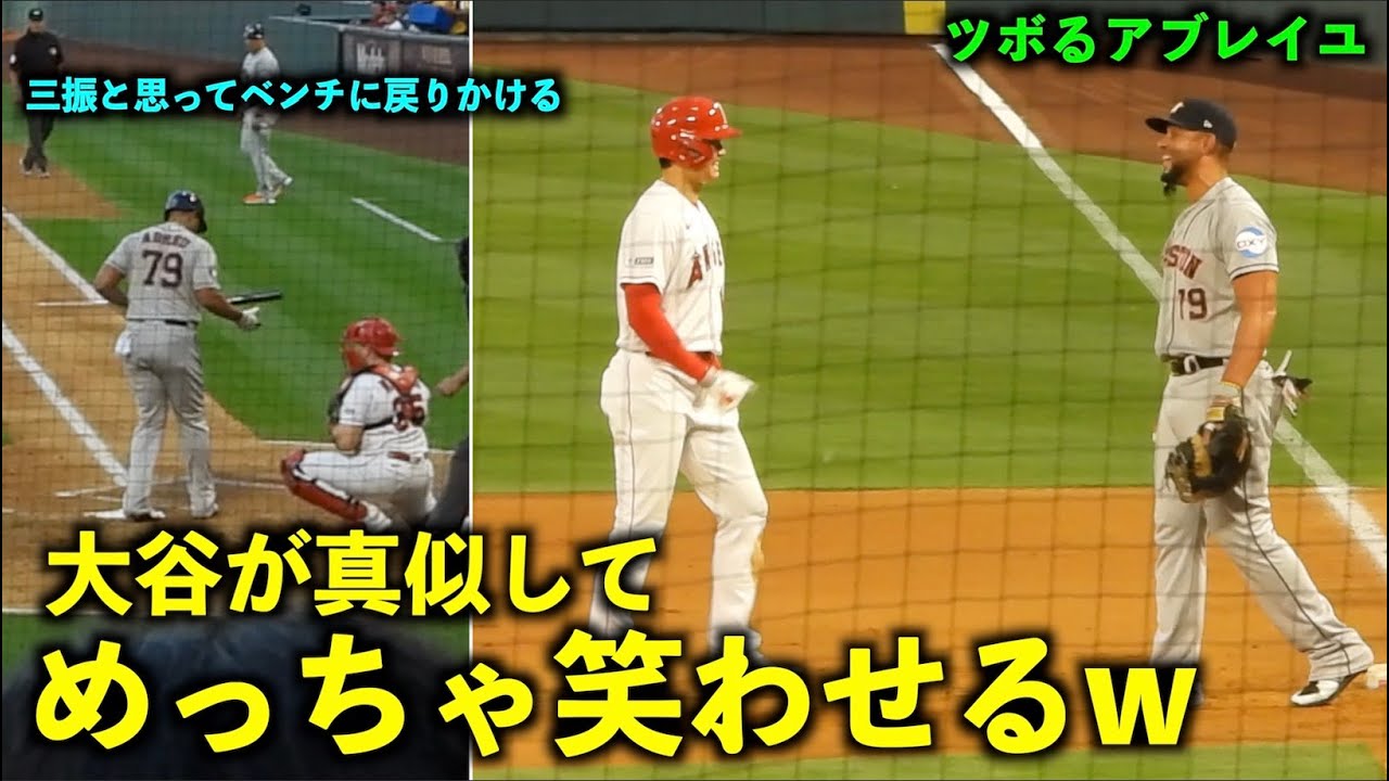 めっちゃ笑ってるw 三振と思ってベンチに戻りかけたアブレイユの真似をする大谷翔平w【現地映像】エンゼルスvsアストロズ第1戦7/15