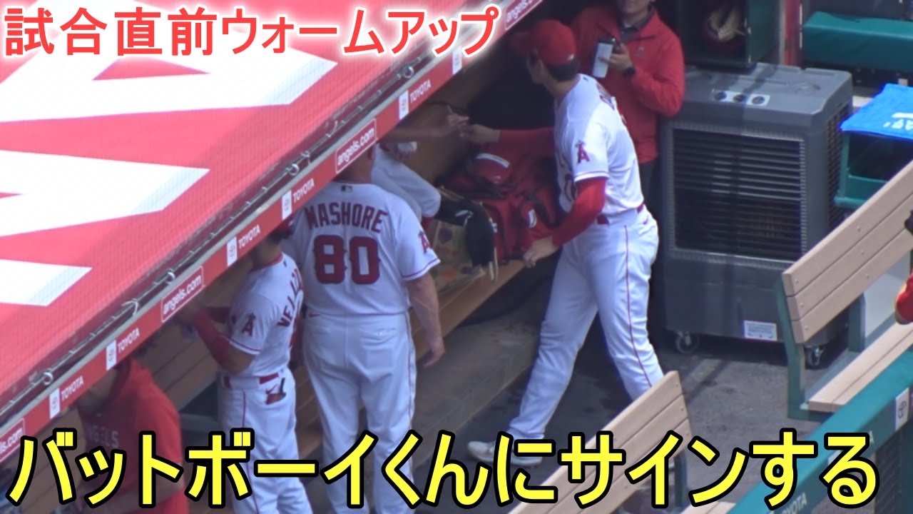 試合直前ウォームアップ~バットボーイくんにサインする大谷翔平選手。