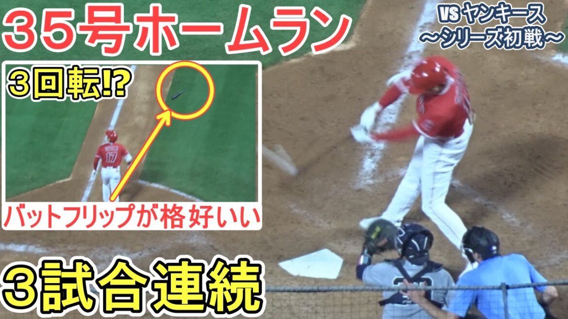35号同点ツーランホームランを打つ大谷翔平選手。3試合連続のホームラン。センター方向の岩場辺りの123m弾。今シーズン59本ペース。