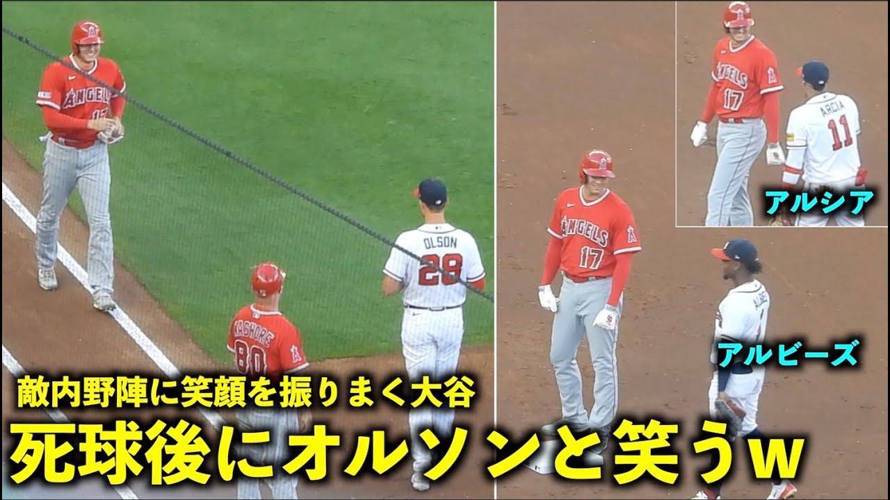 相手野手に笑顔を振りまくw 死球後に仲良しオルソンと笑う大谷翔平【現地映像】エンゼルスvsブレーブス第1戦8/1