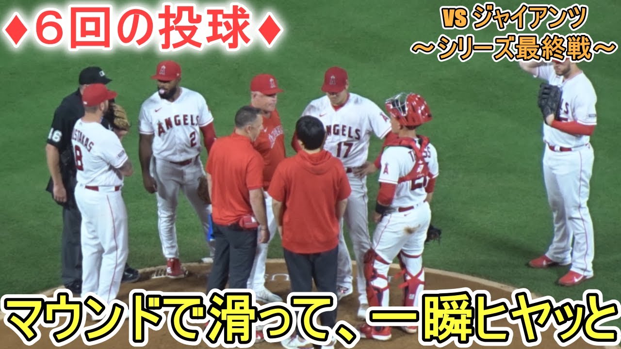 マウンドで滑ってヒヤッとする大谷翔平選手。3回連続で三者凡退に抑える。