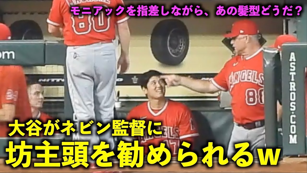 最高のタイミングでテームズコーチ登場w モニアックを指差しながら大谷翔平に坊主頭を勧めるネビン監督w【現地映像】エンゼルスvsアストロズ第3戦8/14