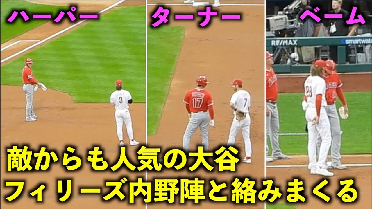 大谷がハーパーやターナーと超スター同士で共演!ヒット後に相手内野陣と絡みまくる!【現地映像】エンゼルスvsフィリーズ第1戦8/29