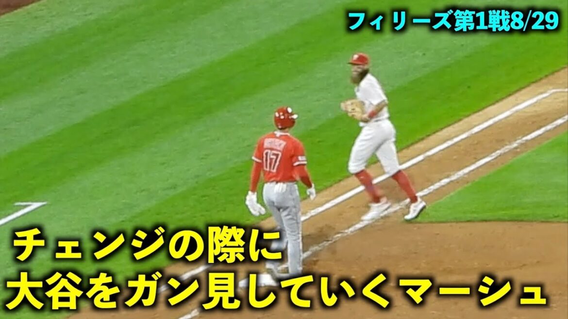 早く絡みが見たい!チェンジの際に大谷翔平をガン見していくマーシュ!【現地映像】エンゼルスvsフィリーズ第1戦8/29