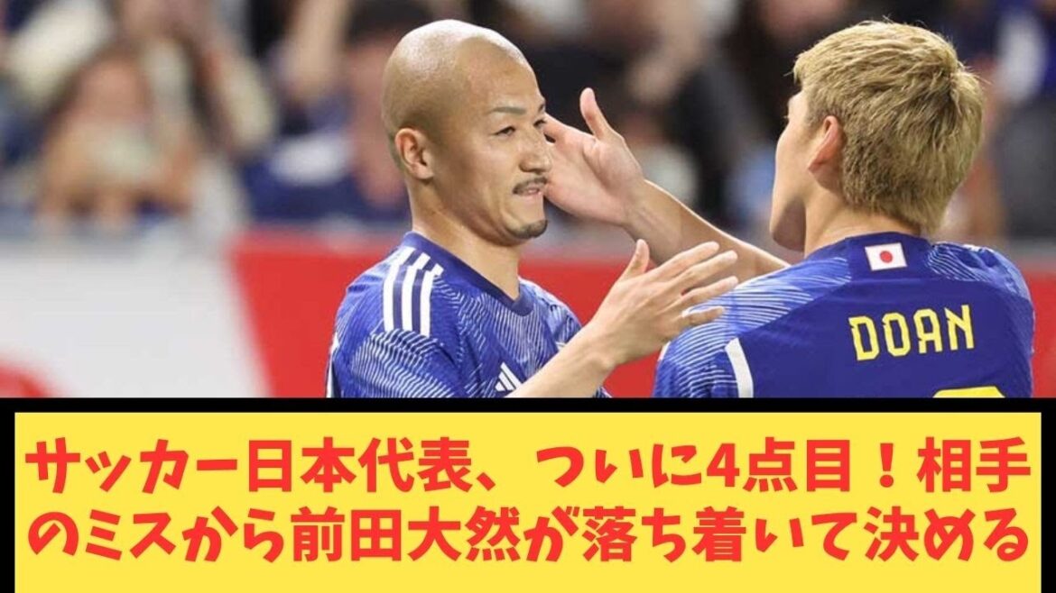 サッカー日本代表、ついに4点目!相手のミスから前田大然が落ち着いて決める