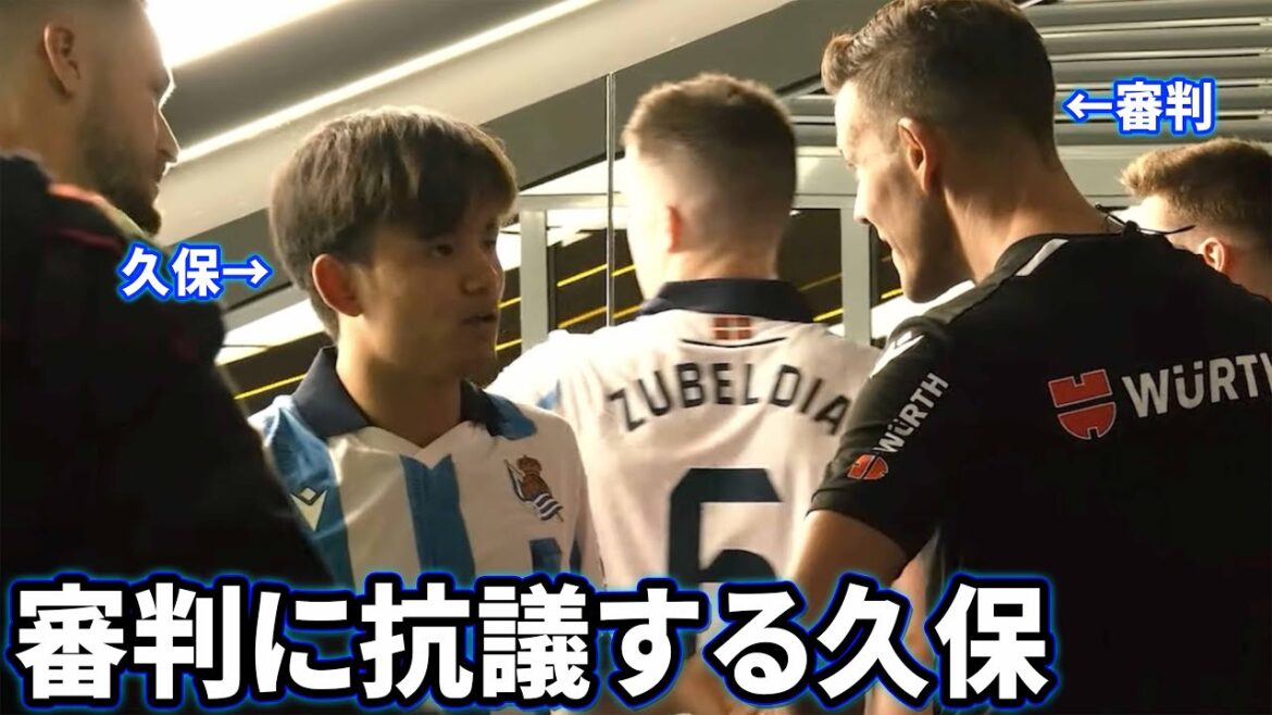 審判のジャッジに納得いかずハーフタイムに抗議する久保建英