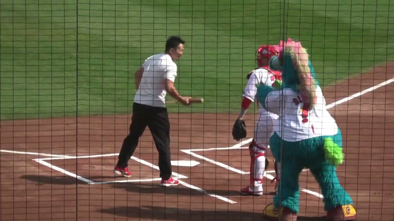 予期せぬゲストに客席がパニックw山本浩二の始球式に鈴木誠也がサプライズ登場!