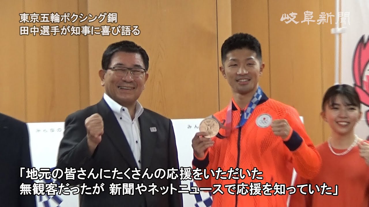 、岐阜県多治見市在住の田中亮明選手。古田肇知事と面談して五輪の激戦を振り返った。無観客で行われた試合だが、地元の応援が力になったという。