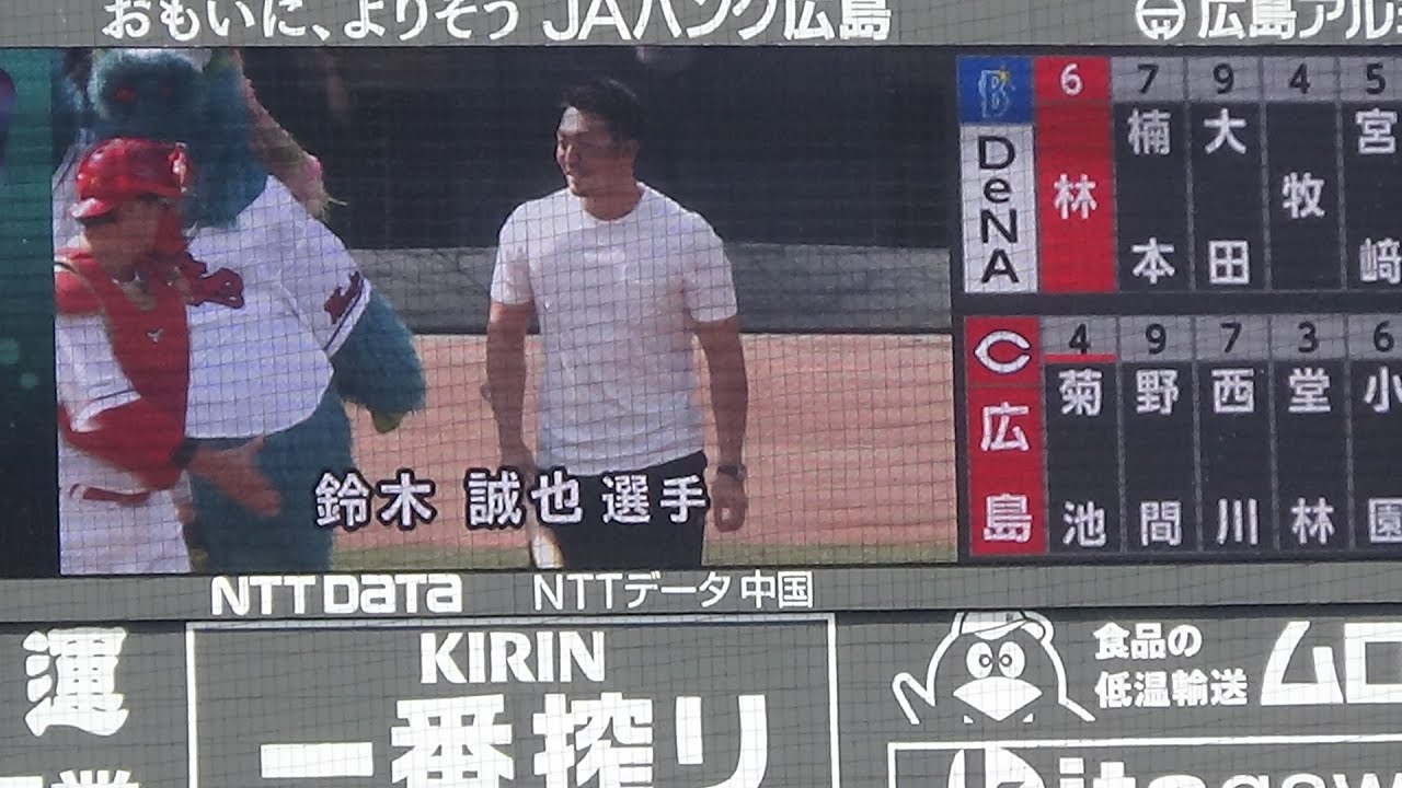ピッチャー山本浩二、対するバッターは鈴木誠也のサプライズ登場。