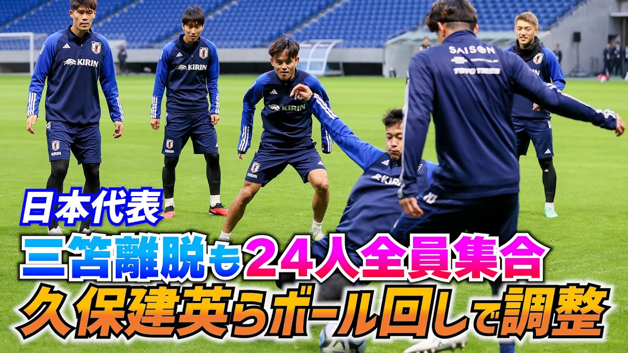 日本代表は15日、大阪府のパナソニックスタジアム吹田で、北中米ワールドカップアジア2次予選・ミャンマー戦の前日練習を行った。MF三笘薫(ブライトン)が同日に怪我でチームを離れた一方、渡航便の関係で帰国が遅れていたDF渡辺剛(ゲント)とDF町田浩樹(サンジロワーズ)が合流。14日は別メニューだったDF冨安健洋(アーセナル)も全体練習に加わり、試合前日にようやく帯同メンバー24人全員が揃った。