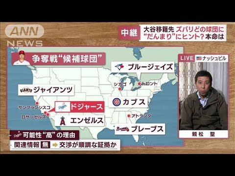 大谷翔平選手の行方を左右するウィンターミーティングが開幕しました。初日に飛び交ったのは移籍候補であるジャイアンツとの極秘会談です。最終候補は6球団とも報じられるなかで本命はどこなのか、急浮上してきた球団も。最新の情勢について、アメリカ・テネシー州ナッシュビルから報告です。