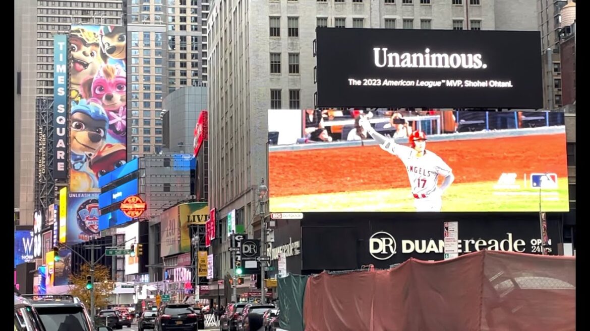大谷選手の2023年アメリカンリーグMVP受賞を祝し、メインスポンサーのニューバランスが、ペンステーション近くの電子看板と同じ内容の広告をタイムズスクエアにも出稿。場所はタイムズスクエアの北側、ブロードウェイとW50丁目の角で、今度は横位置の看板です。