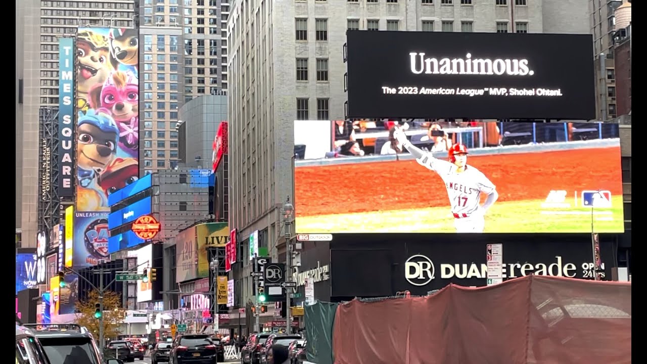 To celebrate Otani’s 2023 American League MVP award, his main sponsor, New Balance, placed an ad in Times Square with the same content as the electronic billboard near Penn Station. This time in a horizontal position, the location is on the north side of Times Square, at the corner of Broadway and W 50th Street.