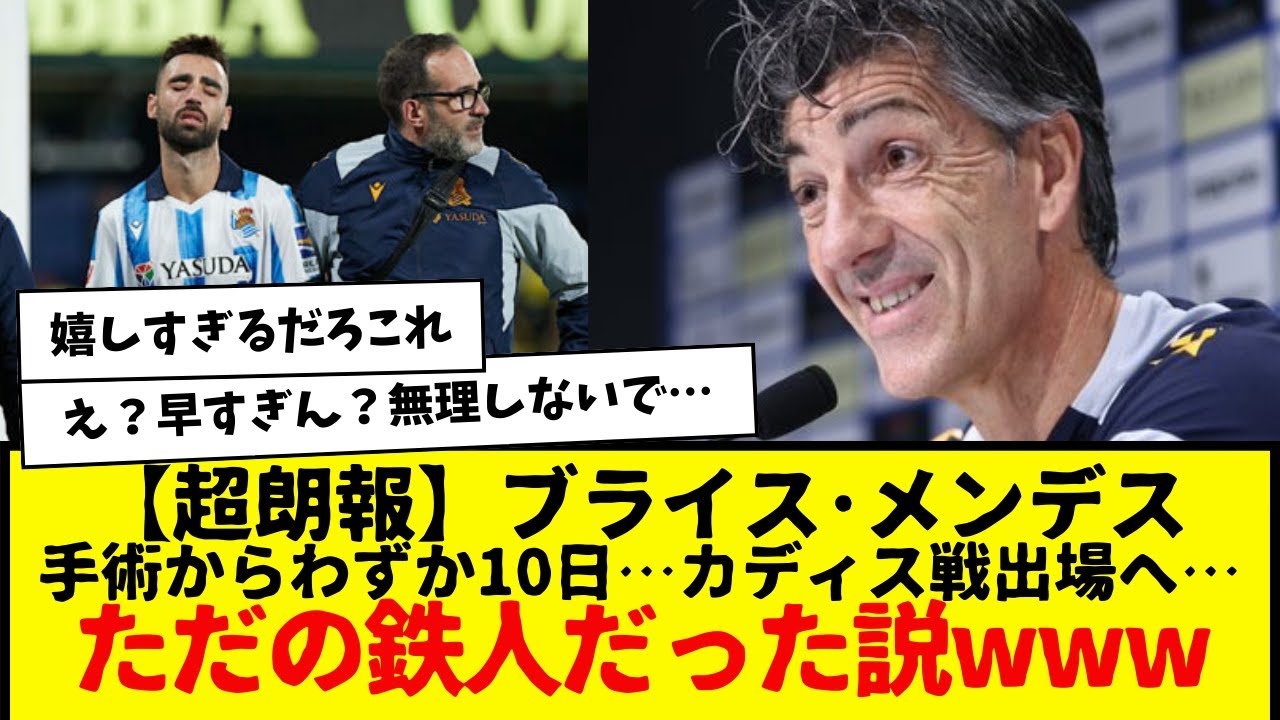 サッカー日本代表でレアル・ソシエダ所属の久保建英さん。久保と同じくチームには欠かせない存在となっているブライス・メンデスさんが骨折で手術を受けたわけだが、どういうことか、明日の試合に出場する可能性が浮上したもようwwwwwwwwwww 鉄人すぎて草www