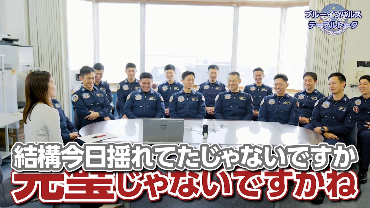 56年ぶりのカラースモーク。史上初となる12機による編成。到着式を終えたブルーインパルスのパイロット14名全員が勢ぞろいしトークをしていただきました。