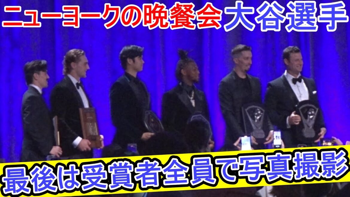 晩餐会の最後は受賞者全員そろって記念撮影をする。大谷翔平選手は各選手としっかり握手で挨拶を交わして会場を去る。